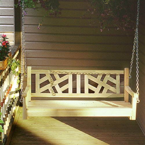 This Chippendale-inspired American Tapestry Cedar Porch Swing features an attractive cross hatch pattern that is representative of the rich cultural tapestry of this great land we live in. There is no better place to relax in the summertime than in a comfortable, American-made porch swing. Handcrafted of the finest unfinished white cedar, this swing also features a contoured seat. Over time, this swing will weather to a beautiful silver/gray patina if it is left unfinished. Porchswing Dimensions: 4 Foot Swing: 48L x 20D X 19H inches5 Foot Swing: 60L x 20D x 19H inches A modern classic porch swing. Distinctive cross hatch backrest . Solid white cedar construction . Available in 2 sizes . Made in the U.S.A. .
