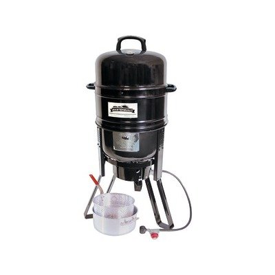 BLACK GRILL/SMOKER/COOKER SYSTEM WITH PORCELAIN FLAME DISK BOWLSOLID STEEL 19_ LP GAS COOKER STAND & CAST IRON BURNER WITH TYPE 1 REGULATOR & HOSE10.5-QT ALUMINUM POT BASKET WITH BASKET HANDLE DRAIN CLIP & THERMOMETERCOOL TO TOUCH HANDLESTEMPERATURE GAUGEUPC : 094428253407Shipping Dimensions : 18.50in X 18.30in X 17.10inEstimated Shipping Weight : 38.85