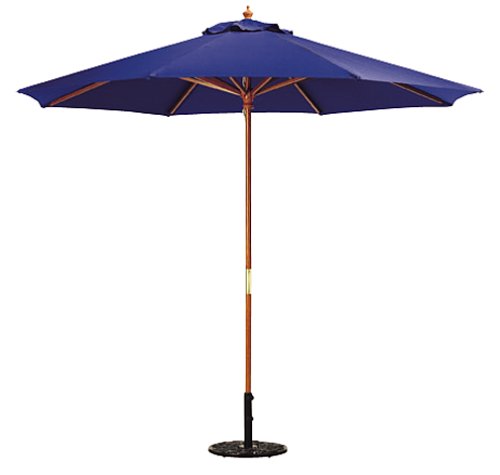 Add a cool spot of shade with this new Navy Blue market umbrella. Our market umbrella frames are made of sturdy 8 ribbed tropical hardwood. With brass fittings throughout and a two pulley lifting system these umbrellas provide a great value found only in more expensive umbrellas. Canvas coverings are made of sturdy 8 ounce polyester canvas which are treated to resist stains and soil. Be sure to check out our sleek 30 lb base to complete your selection.