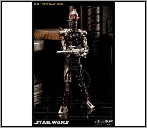 Much of the antidroid sentiment existing in the galaxy is unwarranted bigotry, but even prodroid activists will find it hard to defend the rights of droids bearing arms. The memory of droid armies is still fresh in many minds, and the legions of mechanized troops used by the Trade Federation and other corporate interests paved the way for legislation that eventually did away with the soulless infantry.Relics from that era still exist, such as the battered chrome war droid known as IG88. The tall, cylinderheaded and heavilyarmed mechanical bounty hunter responded to Darth Vaders call to capture the Millennium Falcon during the events surrounding the Battle of Hoth. The IG88 Sixth Scale Figure features Newly Developed and Fully Articulated IG88 Assassin Droid with over 20+ points of articulation Head features light up component (Requires Three (3) LR41 Batteries Included) Fully functioning extendable legs Authentic and hand painted deco application with highly detailed weathering deco Fabric Bandolier with magnetic attachment capabilities One (1) Detailed BlasTech DLT20A Blaster Rifle One (1) Detailed BlasTech E11 Blaster Rifle One (1) Sculpted E11 Blaster bandolier holster Three (3) Mines Two (2) Instrument pins Deluxe Illuminated Display Base (Requires Two (2) AA Batteries Included)