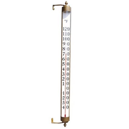 The Vermont Estate Thermometer, is the largest window thermometer on the market, bar none. This thermometer stretches over 38 inches from tip to tip with gigantic 1.125 inch numbers and with its spirit gauge accuracy, there'll be no guessing about the temperature. The solid brass components have been antiqued to a warm patina. An optical quality acrylic tube assures clarity and rigidity, while keeping the weight down to facilitate mounting. It's easily reversible and mounting hardware is included.