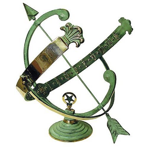 This brass armillary sundial by Rome is made with a solid, thick brass casting. A forceful arrow gnomon commands attention and second glances. Verdigris finish with polished brass highlights. 18" tall with 18" diameter time band. 23" arrow length.